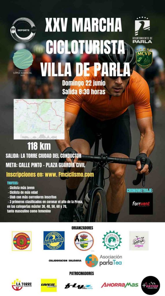 LA MARCHA CICLOTURISTA VILLA DE PARLA CUMPLE SU 25º ANIVERSARIO Se celebrará el próximo domingo 22 de Junio sobre un distancia de 118 kilómetros El próximo 22 de Junio llega una nueva edición de la Marcha Cicloturista Villa de Parla. La prueba, que cumplirá sus bodas de plata (25 años), contará con la organización de la Peña Ciclista Solera, Club