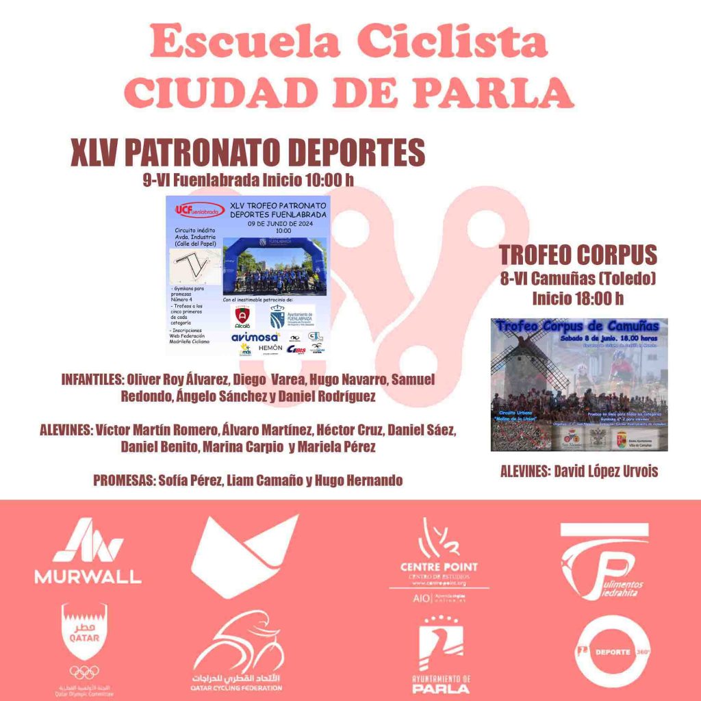 ESCUELA CC CIUDAD DE PARLA: CAMUÑAS Y FUENLABRADA ESPERAN NUEVOS ÉXITOS DE NUESTROS CAMPEONES Los calendarios de ruta de Castilla-La Mancha y de la Comunidad de Madrid ofrecen este fin de semana dos nuevas oportunidades de brillar para la Escuela del #CCCiudaddeParla. El director Luis Fernando Varea tendrá el sábado al alevín David López Urvois, flamante campeón regional de gymkana,