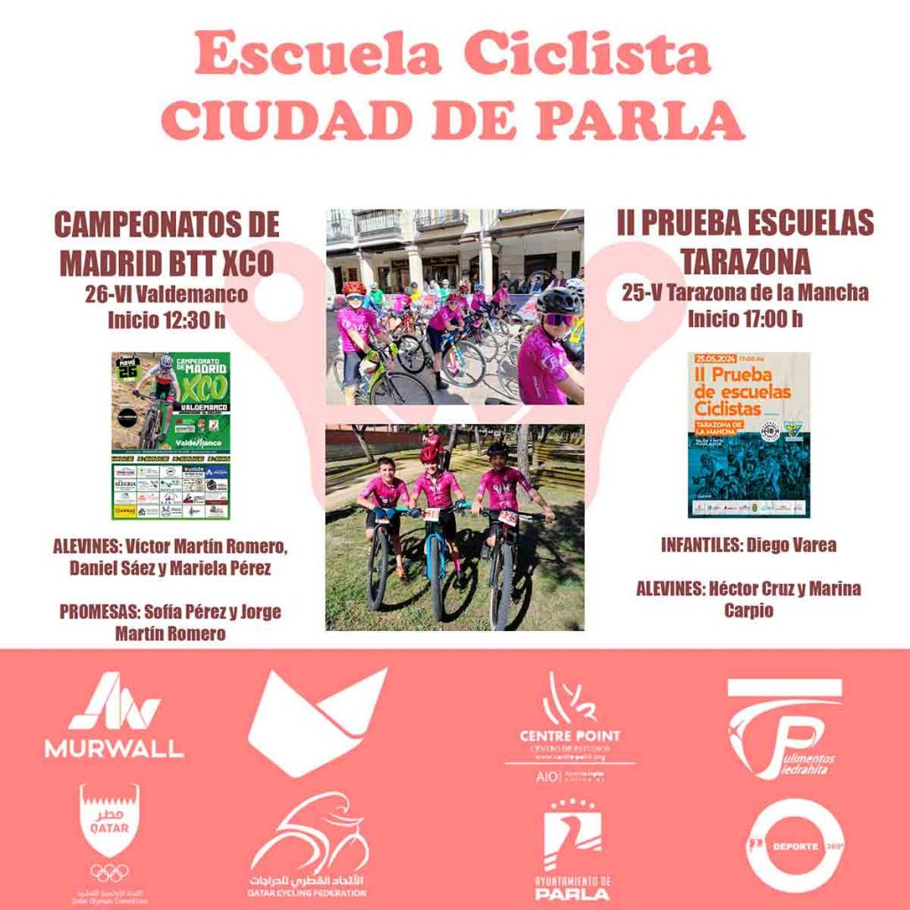 PRESENTAMOS AL EQUIPO DE ESCUELAS DEL CC CIUDAD DE PARLA PARA LA TEMPORADA DE CARRETERA Hace unos días la Escuela del #CCCiudaddeParla arrancó la temporada de carretera en Almagro (Ciudad Real), donde pisó el podio. Posteriormente, la vimos brillar en Los Yébenes (Toledo) y estrenar su presencia en el calendario de la FMC, en Paracuellos del Jarama. Y la semana