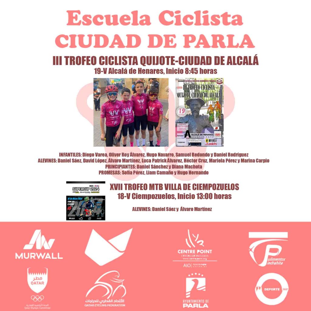 ESCUELA CC CIUDAD DE PARLA: CIEMPOZUELOS Y ALCALÁ DE HENARES, PRÓXIMAS PRUEBAS PARA EL EQUIPO Este fin de semana, la #CCCiudaddeParla volverá a doblar presencia en BTT y carretera. El sábado irá a Ciempozuelos para cerrar la Super Cup MTB Kids en su 7ª y última puntuable. Allí estarán los alevines: · Daniel Sáez · Álvaro Martínez Ambos correrán sobre